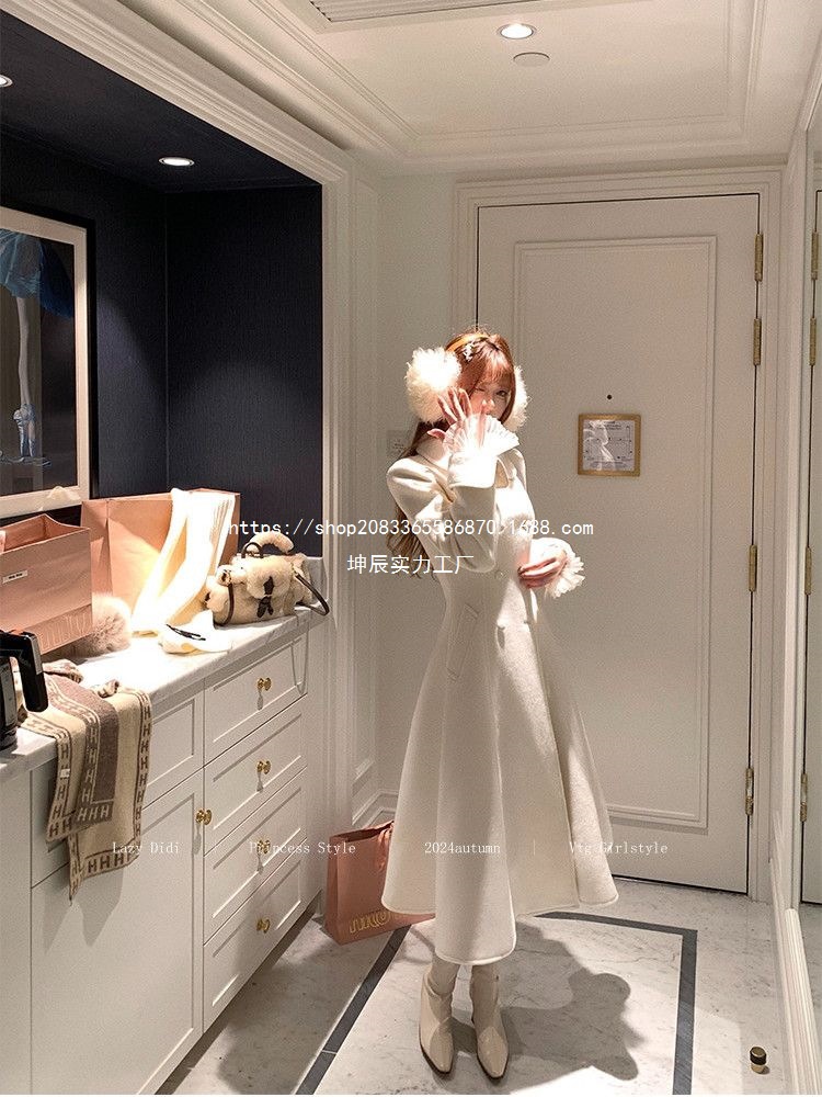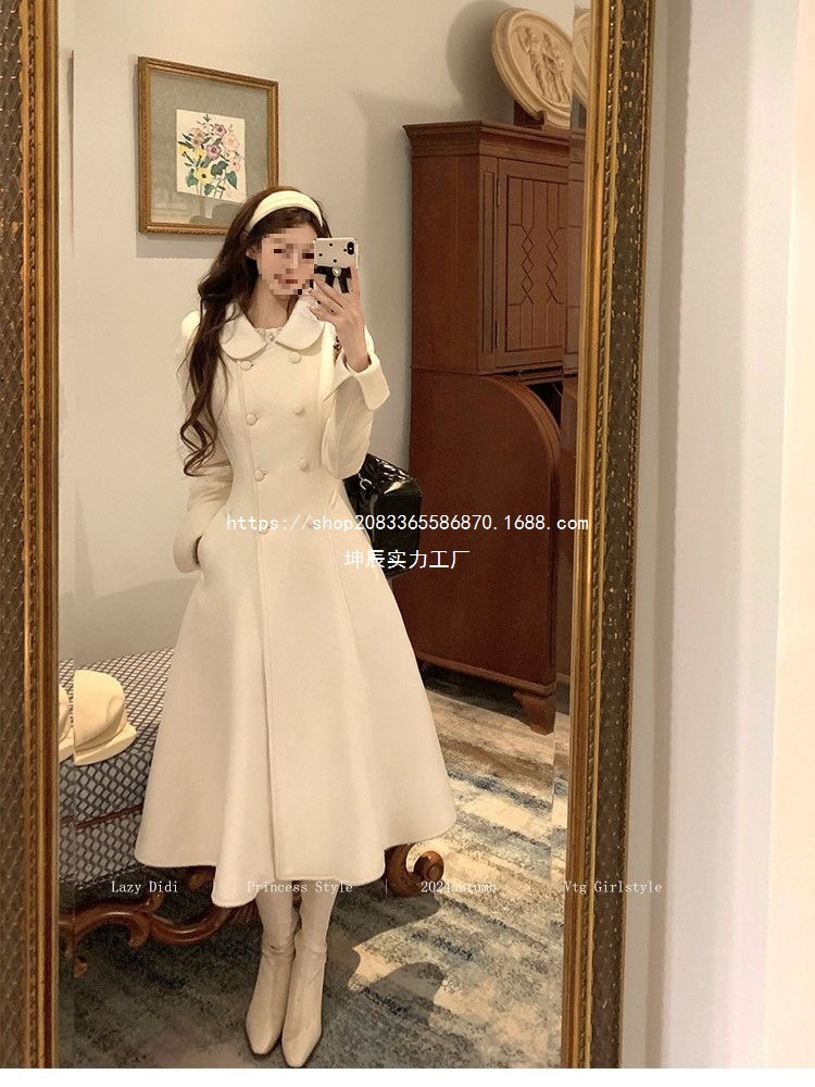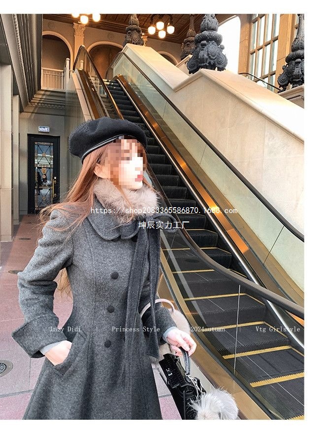 French Hepburn Korean Style Long Coat With Cotton Lining And Fur Collar, Double-Breasted Design, New Autumn And Winter Style, Elegant And Slimming